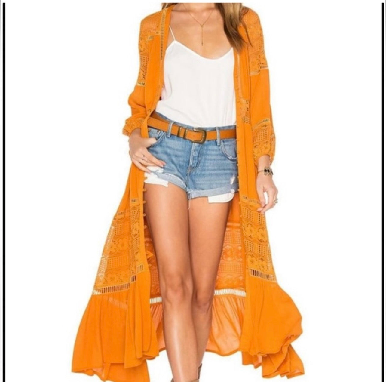 A truly stunning luxe-lace midi dress w/ beautiful detailing on the arms & waist in rich maple tones. Floral & lattice lace lends dimension to this swingy SPELL midi dress. Fabric-covered buttons secure the placket, & gathers at the seamed hem create a soft ruffle. Slim cuffs refine the loose long sleeves.